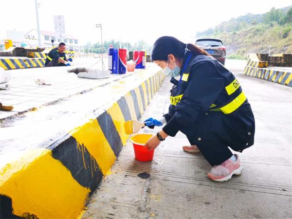 这不天刚放晴,大家立马开始准备,戴好口罩,穿好反光背心,提着小油漆桶,一群人全副武装就加入到了粉刷队伍……一天劳作下来,虽然腰酸背痛,但没人喊累。经过粉刷后的车道面貌焕然一新,醒目的颜色不仅亮化了岗亭路域,给司乘人员提供一个良好的出行环境,更为过往司乘人员的安全提供了进一步的保障。
