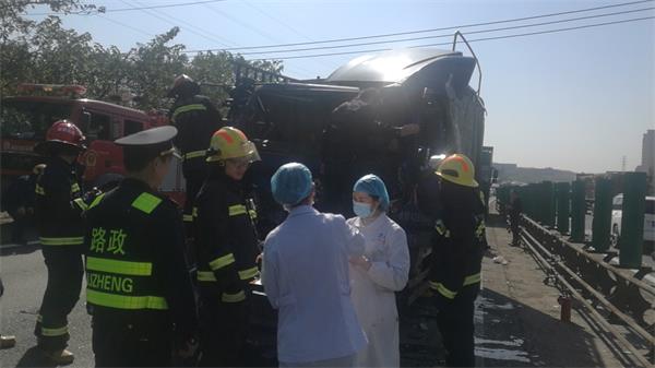 11时25分施救、养护、消防、120先后到达现场。经120急救中心人员确定受伤的车主情况稳定可以开展救援,路产队员立即协助消防人员将被卡住的车主救出,送到120急救车上。