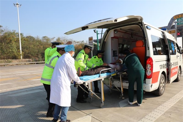 医护人员在消防救援人员、交警、路产人员协助下,抢救受伤的司乘人员脱离险境并火速送往医院救治。