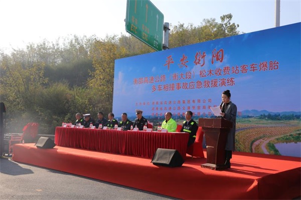 这是由湖南省高速公路集团有限公司、湖南省高速公路交通警察局衡阳支队、湖南省高速公路集团有限公司衡阳分公司等单位共同主办的一场客车爆胎多车相撞事故应急救援演练现场。
