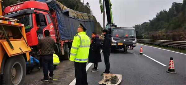 大队人员到达现场后,经现场勘查,一台豫L****8中型货车撞向右侧护栏侧翻在应急车道和护坡上,无人员受伤,未造成交通阻断,不影响通行。据当事人吴某介绍,当天下午他从河南漯河拉二千五佰件重约13吨总价值大约二十来万的瓷器(碗,盘子)运至深圳至长沙时,因避让左侧超车道大挂车导致,现在只心疼车上货物损坏情况。临时指挥部面对低气温、天空飘着细雨、晚上23时许视线不好、施救难度大、防止二次事故的发生等环境,同时为了尽量减少当事人的货物损坏更少,临时指挥部决定由交警、路产、施救三家单位在现场进行驻守到天亮再实施救援的方案。同时同各自的平台告知往南车俩行驶至此路段时,注意减速等。