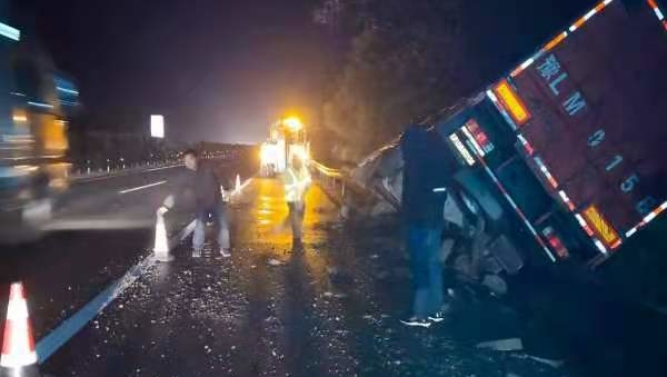 11月25日23时20分许,湖南高速集团长沙分公司长沙东路产大队值班室接到辖区交警告知,称:“京港澳高速K1457+980M北往南一台货车侧翻。”