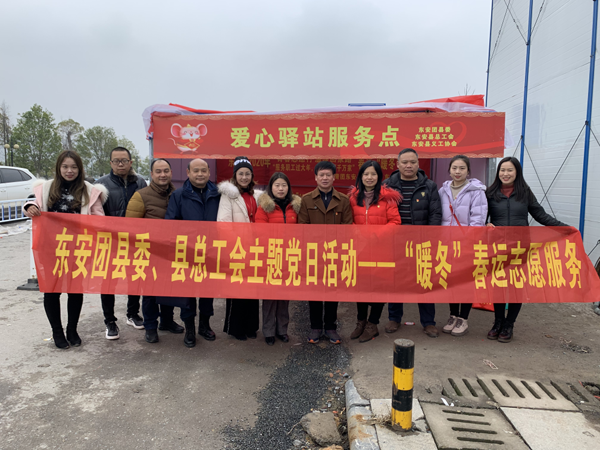 为帮助广大务工农民工平安返乡,2020年1月17日,在新春到来之际,永州市东安县总工会、团县委机关支部全体党员到东安县高铁站、县城交通中心开展“暖冬”行动主题党日活动,用真情温暖返乡农民工的回家路。