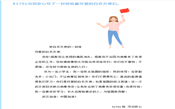周南望城学校X1701冯刘安心致最可爱的白衣天使们的一封信。表达了对奋战在一线的白衣天使的感激之情,号召大家共同努力,共同战“疫”。