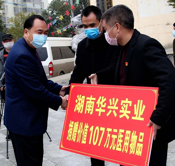 2月17日,湖南华兴公司董事长向长江将1500套防护服捐赠给隆回县新冠肺炎防控领导小组。