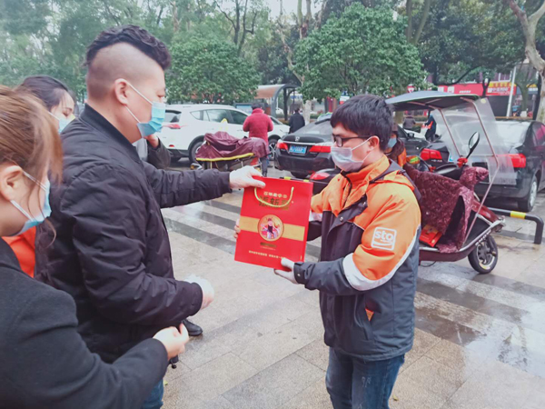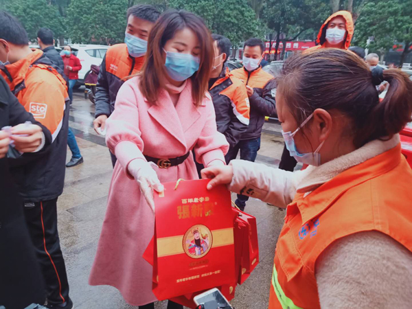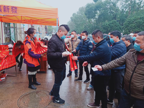 2月27日,春雨绵绵,爰心涌动,常德张新发门店向常德市区外卖小哥、的士司机和环卫工人赠送2000个爱心大礼包和10只口罩。在每个礼包内都有口罩和槟榔。这些城市守护者凭工作证可在常德市区张新发各门店扫码免费领取。口罩紧缺,他们有的赶紧换上了新口罩,有的赶紧揣在了包里,眉眼间都是满满的笑意。
