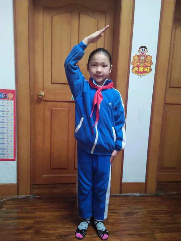 2020年2月24日早上8点,伴随着准备好的天安门广场升旗仪式视频,一个个佩戴红领巾的少先队员们看着电视、手机、平板电脑等各种电子设备中缓缓升起的国旗,在客厅、家门口、院落里,身姿挺拔、神情肃穆地面向国旗庄严的敬礼。