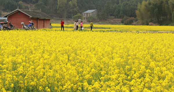 3月14日,在湖南怀化市靖州县横江桥乡游人和市民在油菜花田里用手机自拍,呼吸春天的气息。(丁勇)