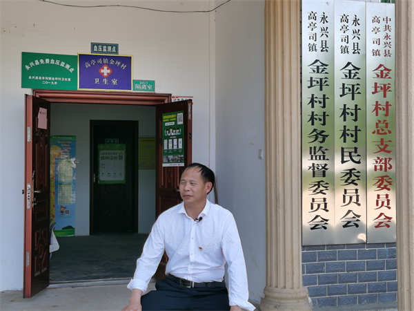 (金坪村村支书刘平光坐在村委会办公楼前)