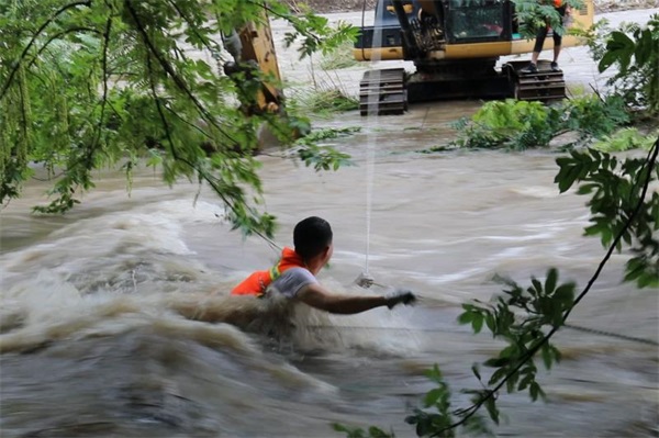 挖掘机向对岸缓慢移动,消防员迅速到达对岸救援位置。消防员将救援绳索抛给被困人员,然后将另一根绳索顺利拉过去。消防指战员一边架设横渡系统,一边指导被困人员利用绳索做好保护。