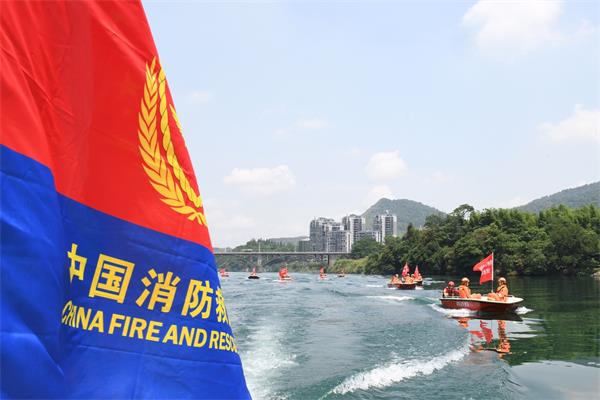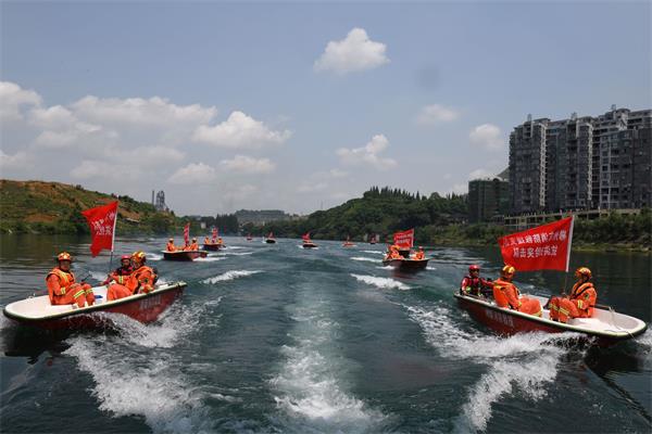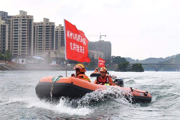 这是发生在郴州市防汛减灾应急演练中的一幕,演练假设东江湖因持续强降雨导致水位暴涨,来不及转移的群众被困孤岛,惊慌之余数人落水,另有数人坠入湖中不知去向。郴州市消防救援支队接警后,调集约80名指战员携带装备器材火速赶往集结点。到达集结点后,各参演单位按照任务分工迅速开展灾情侦查、目标搜救等实战训练科目。