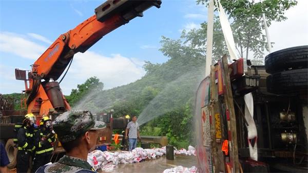 9时52分,大队救援力量到达现场,经侦查和询问知情人,侧翻罐车为汽油罐车,核载油量为20吨,实际载油量为20吨,从枧头镇开往县城,司乘1人,在s323路段因路面湿滑且转弯时车速过快又操作不当引发侧翻,无人员被困,罐车人孔盖处油品泄漏,无法堵漏,现场汽油蒸汽压不断扩大,如不及时处置,将会引发爆炸事故!县应急管理局迅速联络交警、电力、环卫、环保、中石化等联动力量到场组成应急救援指挥部。县消防救援大队结合灾情迅速划分低、中、高三级危险区域,由大队教导员带领攻坚力量负责高危区作战指挥,各联动力量配合行动,有效做好了作战保障工作。及时管制了交通、切断了现场高压线路、禁绝了现场火源。消防大队第一时间出动三支泡沫水枪直抵高危区域,进行稀释保护,预防爆炸事故发生,并安排两名攻坚组队员实施堵漏作业。根据指挥部指令,县民兵应急分队迅速用沙袋在事故槽罐周边设置围堰,防止油水混合液无序蔓延引发延烧爆炸风险,为救援成功发挥了积极作用。13时30分,各项工作准备就绪后,在泡沫水枪掩护下,成功实施了起吊作业。15时10分侧翻罐车车体被扶正,15时50分实施倒罐作业,18时30分倒罐工作圆满完成。19时20分,新田大队完成现场安全隐患清理,并收整器材、归队恢复战备。