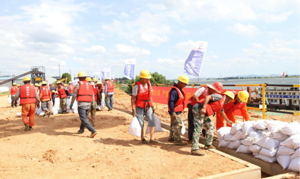 阶段二:“项目所在湘江河段水位不断上涨,水位涨至距离堤顶仅1米且上涨趋势仍不减,防洪度汛领导小组立即启动红色汛情预警(Ⅰ级)”,应急救援组紧急组织25名抢险队员进行子堤围堰修筑,20多人一字排开传递沙袋进行子堤修筑,抢险过程中有人突然中暑,通过紧急联系医疗救护组,应急车辆及时到达并对伤员进行有效救治。