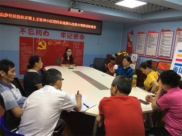 7月3日上午9:30,由社区党总支书记牵头,组织上王家冲小区党员代表、志愿者骨干、物业代表、网格员等,召开联动协商会。主要以“党建引领+党员带头+志愿服务”模式,联动协商再将上王家冲小区定为创建居民家庭源头垃圾分类示范小区。