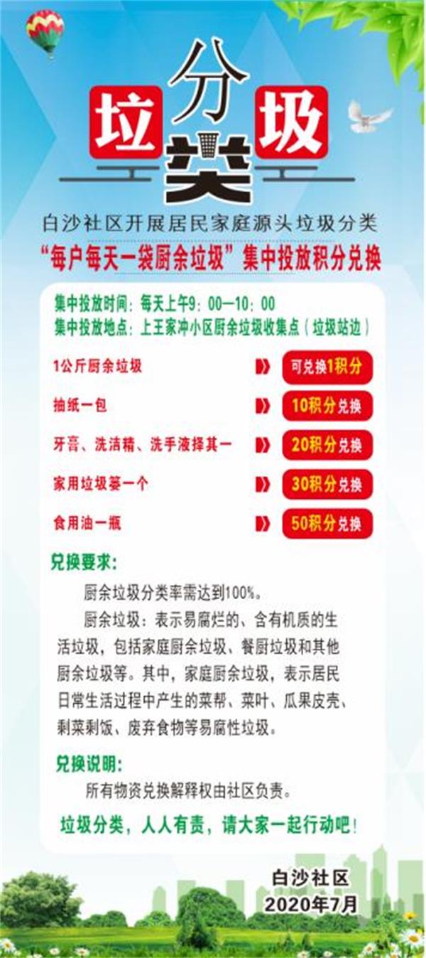 为了进一步提高居民的垃圾分类意识,推动小区垃圾分类工作常态化,积极打造环保绿色社区,为居民群众提供干净、舒适的生活环境。砂子塘街道白沙社区继2020年上半年创建了“高层小区垃圾分类示范小区”后,计划从7月份开始,再创一个“上王家冲小区垃圾分类示范小区”。