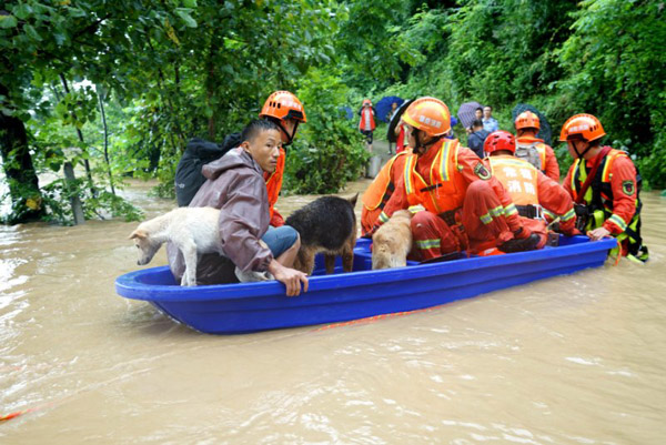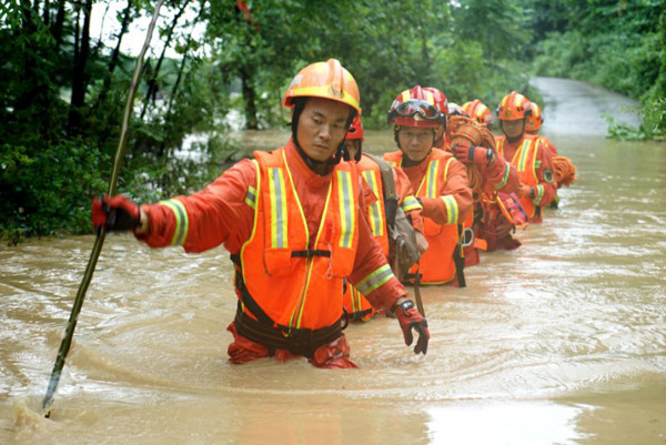 消防指战员抵达距离灾害现场还有4公里时。由于山体滑坡原因,山上泥土和冲垮的树木已将道路堵塞,洪水已淹过马路一米多深,消防车根本无法驶入,现场全体消防指战员下车携带水域救援器材装备,徒步赶赴现场。经过50分钟左右的徒步涉水,消防指战员抵达灾害事故现场,到达现场后现场指挥员立即被困群众联系,得知4名被困人员已被乡政府相关救援人员转移至安全地带,在得知被困人员得救后,现场消防人员立即分成三个救援分队分头对受灾严重的区域进行疏散。
