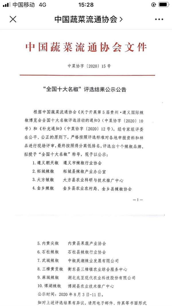8月5日,记者从第5届贵州·遵义国际辣椒博览会获悉,三樟黄贡椒在全国十大名椒评选活动中成功入选,荣获“全国十大名椒”称号。