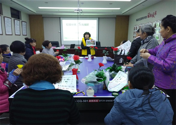 “制作绢花花瓣的材料是什么垃圾?”社工吴姐不忘向大家提问题普及垃圾分类的知识,“是可回收垃圾”、“是其他垃圾”大家展开了热烈的讨论,“制作绢花花瓣的绢布是其他垃圾,金属丝是可回收垃圾”社工吴姐这种源于生活的垃圾精准分类科普让大家一下子就就记住了,随后大家还一起学习了《长沙市生活垃圾管理条例》。