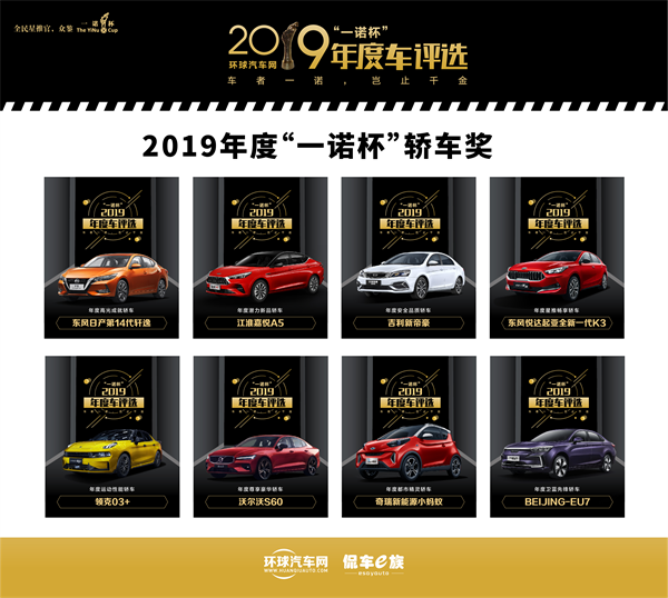 “一诺杯”轿车奖,分别是东风日产第14代轩逸荣获年度高光成就轿车、江淮嘉悦A5荣获年度潜力新品轿车、吉利新帝豪荣获年度安全品质轿车、东风悦达起亚全新一代K3荣获年度星推畅享轿车、领克03+荣获年度运动性能轿车、沃尔沃S60荣获年度尊享豪华轿车、奇瑞新能源小蚂蚁荣获年度都市精灵轿车、BEIJING-EU7荣获年度卫蓝先锋轿车。