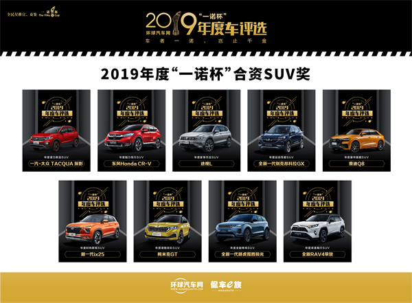 “一诺杯”SUV奖,分别是一汽-大众TACQUA探影荣获年度潜力新品SUV、北京现代新一代ix25荣获年度时尚新锐SUV、上汽斯柯达柯米克GT荣获年度潮酷劲彩SUV、东风Honda CR-V荣获年度魅力悦行SUV、一汽丰田全新RAV4荣放荣获年度卓逸畅行SUV、全新一代别克昂科拉GX荣获年度运动性能SUV、上汽大众途观L荣获年度家享杰出SUV、全新一代路虎揽胜极光荣获年度全能锋尚SUV、奥迪Q8荣获年度豪华旗舰SUV。