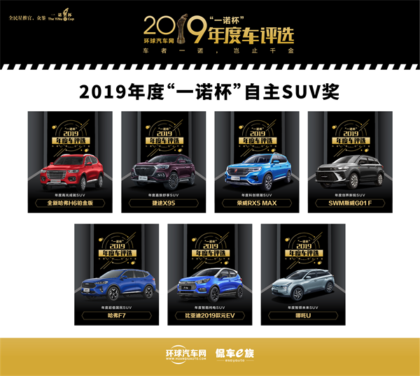 另外,全新哈弗H6铂金版荣获年度高光成就SUV、捷途X95荣获年度嘉旅舒享SUV、荣威RX5 MAX荣获年度科创领潮SUV、SWM斯威G01 F荣获年度创界新锐SUV、哈弗F7荣获年度超值国民SUV、比亚迪2019款元EV荣获年度智酷纯电SUV、哪吒U荣获年度智领未来SUV。