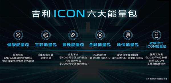 疫情之下,共克时艰,众志成城,吉利同在。面对当下用户关切的健康安全问题,吉利ICON将率先全系标配中汽研官方CN95认证的真车规级“CN95”高效复合空调滤芯,全面树立同级健康、安全新标杆。与此同时,吉利ICON特为广大消费者、驰援一线的“逆行者”送上“六大能量包”:全系标配车规级CN95高效复合空调滤芯,所有银河限量版用户免费升级的健康能量包;包括24期0息、最高5000元贴息的金融能量包;最高4000元补贴的置换能量包;5年车机流量免费的互联能量包;发动机主要零部件享8年或30万公里超长质保的质保能量包,值得一提的是,所有医务工作者2020年6月30日前购买吉利,可享受的终身免费保养服务的“致敬时代ICON能量包”。