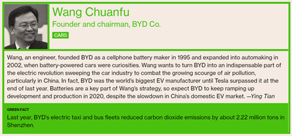 近日,全球最大财经资讯公司彭博社发布2020全球30位环保先锋榜(The Green 30 for 2020),其中,比亚迪创始人兼董事长王传福位列其中,成为榜单中唯一的中国车企领导人,一同上榜的还有微软创始人比尔·盖茨等商业精英。