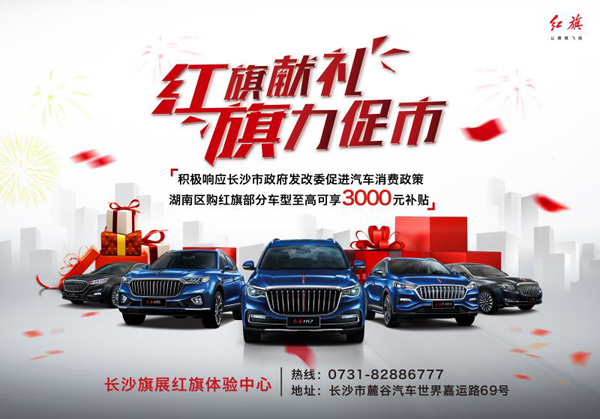 积极响应长沙促进汽车消费政策,长沙旗展红旗店主动助力救市政策,即日起前往长沙市任意红旗体验中心购红旗并在长沙本市上牌,红旗部分车型至高补贴3000元。全系还有7重礼遇: