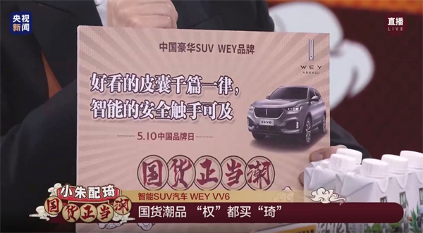 5月10日晚8点,央视新闻联合天猫国潮为中国品牌日专门定制的“国货正当潮”专场火热来袭,“小朱配琦”经典组合再度出山,倾情直播带货当潮国货。其中,中国豪华SUV WEY品牌旗下VV6,作为本场直播中唯一的汽车品类代表,更由央视名嘴朱广权首次体验后亲自力荐。伴随有感而发的金句奔涌,全场直播最高在线人数高达4013.7万次、获赞2564万次,期间天猫长城旗舰店访客量暴增59万人次,实现了高效引流转化。WEY VV6 整车订金订单 7473笔,高达44036人参与抢购限时秒杀的VV6半价车,10点整秒售罄,预计销售金额近12亿元,创下线上营销新纪录。WEY品牌首次尝试直播带货即成为刷屏事件。