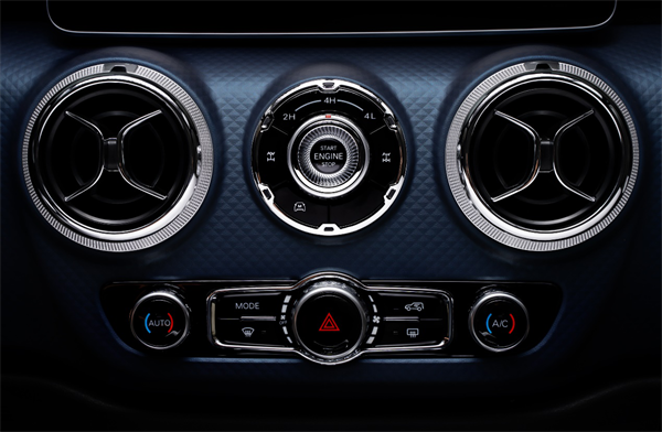 BJ40致敬2020版内饰风格与家族和谐统一,仔细观察不难发现,中控台电控分动箱控制旋钮两侧的两个按键,侧面回应了坊间对于新品“具备前后轴差速锁”的猜测。由此可见,凭借致敬经典而复出的特殊身份, BJ40致敬2020版有望计划以电控分动箱与电控前、后差速锁的当代极致越野标准致敬BJ2020光辉岁月。通过驾驶员主观预判、主动切换,两把差速锁可以极大保证车辆在复杂越野路况下的通过性,新品将会展现出的越野实力可见一斑。