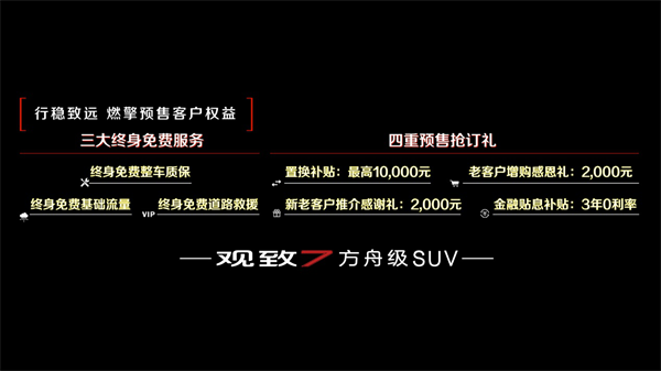 全新观致7共推出六种配置车型,预售价格区间为10.98万-16.18万元。与此同时,观致7还相当有诚意的推出了三大终身免费服务及四重预售抢订礼。