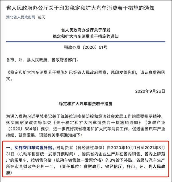 于9月26日出台的《稳定和扩大汽车消费若干措施》规定自2020年10月1日至2021年3月31日,针对湖北省内企业生产并在省内销售、省内上牌落户的乘用车,按照销售价格的3%给予补贴。这是湖北省政府为促进全省汽车行业持续、健康发展所做出的利好举措。