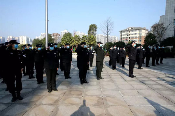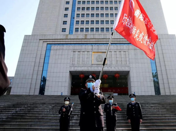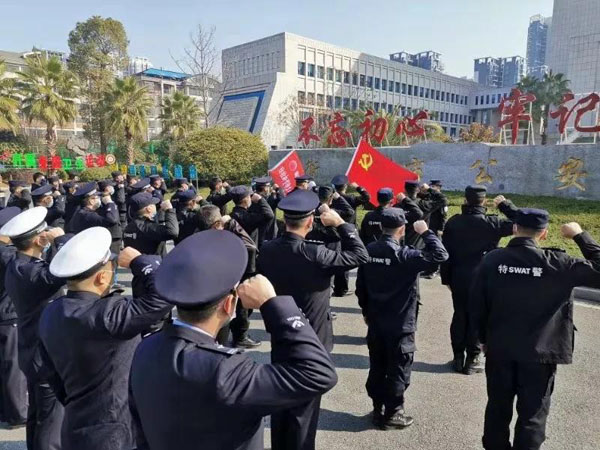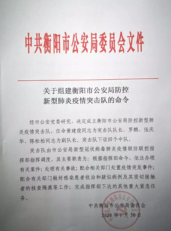 2020年1月30日(农历正月初六)上午9点30分,衡阳市公安系统第一支疫情防控突击队——衡阳市公安局防控新型肺炎疫情突击队组建成立,并举行简朴庄重的授旗出征仪式。这支突击队由200名自愿报名参加的公安民警组成,分一、二两个梯队承担防控疫情应急处突任务。衡阳市副市长、市公安局局长胡志文出席授旗仪式并为突击队授旗,勉励大家以实际行动担当作为,让党旗在防控疫情斗争第一线高高飘扬。