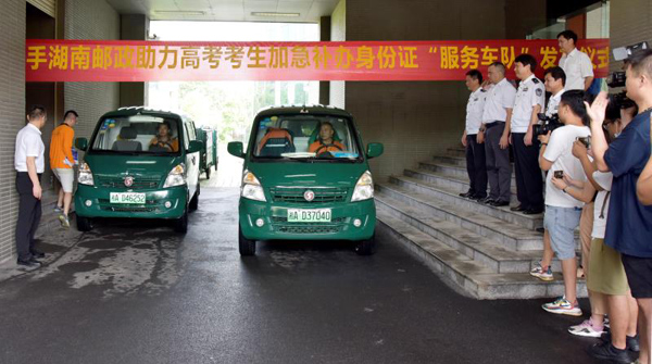 2020年6月24日,湖南省公安厅再次开通高考考生身份证补办加急“绿色通道”,携手湖南邮政高效寄递、次日送达,共同为三湘学子保驾护航。全省公安机关涉及身份证补办受理、核验、审批、制证、寄递等各环节的数千名民警郑重承诺:3个工作日内完成高考考生身份证补办流程,做好三湘学子高考的保护神。