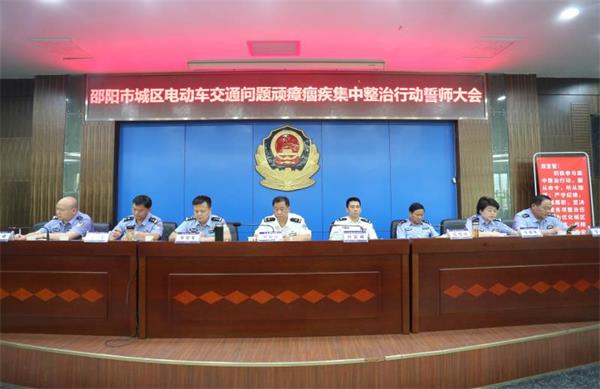 邓启元在充分肯定交警工作取得突出成绩后指出,邵阳交警是一支敢打硬仗,能打胜仗的队伍,今天我们举行誓师大会,目的就是动员全警用“最高标准、最严执法、最实举措”,全力打好市城区电动车交通问题顽瘴痼疾攻坚战。希望全体民警、辅警要在市委、市政府的坚强领导下,在全市各级各部门的共同努力下,坚定集中整治工作的信心和决心,齐心同力推进整治。同时,他还希望大家应牢固树立“以人民为中心”的交通管理发展理念,对标对表《市城区交通问题顽瘴痼疾集中整治总体方案》和《市城区电动车交通违法集中整治工作方案》,全面压实工作责任,细化工作任务,并通过制定具体工作措施,落实领导靠前作战,强化三区属地职责,抓实、抓细每个工作环节,全力确保邵阳市城区电动车交通问题顽瘴痼疾集中整治工作实现“快节奏、高效率”推进。