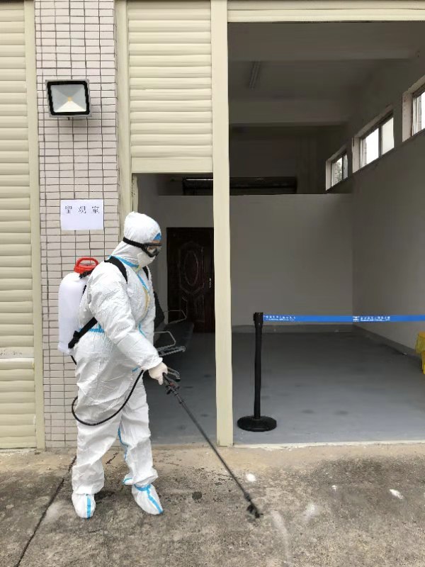 只见她正背着一大瓶重约25斤的消毒药水,对整个留验站区域进行喷洒消毒。因为行装臃肿,加上药水沉重,看上去有些吃力,但是她动作麻利,轻车熟路,一副势不可当的抗疫“铁娘子”风范。