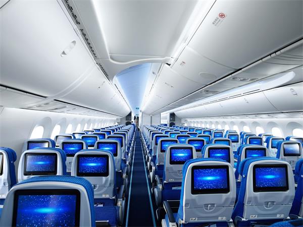 波音787机型被称做“梦想客机”。在舷窗设计上,波音787拥有比目前大多数飞机更大的舷窗,用电动光线调节代替了传统的遮光板,旅客可根据需要调节明暗。在公务舱和经济舱都配备了个人高清电视,旅客可在飞行过程中享受丰富的影音娱乐节目。飞机客舱使用“天空内饰”,在部分区域采用了弧形设计,富有现代气息的天穹顶造型以及柔和的照明,使乘客仿佛置身于开阔的苍穹下。波音787的客舱空调系统采用了新型气体过滤技术,在增大座舱空气湿度的同时使空气更为清洁,为旅客提供了舒适的乘坐环境。
