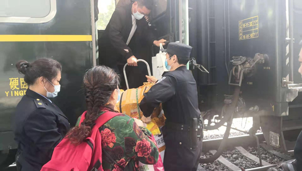 在候车室,很多出行群众大包小包,携带的行李很多,从候车室口到站台有一段距离,特别是在下台阶和上车的时候,非常不便。怀化东站派出所的志愿者纷纷主动上前,抬的抬,扛的扛,快速帮助他们把包裹运送到乘车点。