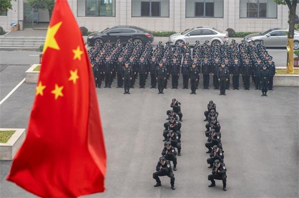 随着指挥员一声令下,四名特警队员高擎警旗正步入场,现场全体民警向警旗行注目礼,迎接警旗。