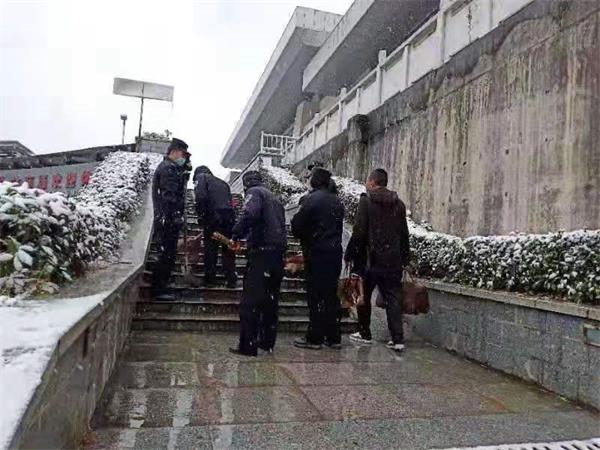 该日早上,怀化铁路公安处石门站派出所值班室就接到一名旅客的建议电话:石门县北站广场两侧近20级台阶由于下雪结冰路滑,旅客上下台阶极容易摔倒,希望解决一下。接到电话后,为了方便旅客上下台阶,解决旅客出行安全问题,石门站派出所党支部迅速组织民警,带上铲子、扫帚,对石门县北站广场两侧阶梯积雪、坚冰进行清扫,及时消除下雪路滑这一安全隐患,这一举动也受到过往旅客的一致称赞。