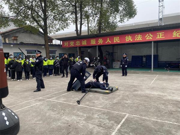 活动中,民警带领学生代表参观了值班室、询问室、信息采集室、荣誉室等场所,详细介绍了这些场所的具体功能和使用情况以及麻阳站派出所的日常工作,民警向他们讲解了民警在办案功能区办案、讯问犯罪嫌疑人的情况及办案区视频电子监控设备管理情况等等,使他们了解到了派出所工作情况。随后在民警的带领下,来到了所内荣誉室,参观了荣誉室奖牌、证书,认真聆听每一份荣誉背后的感人事迹。同时由麻阳站民警代表向学生进行了队列训练、警棍对抗、盾牌攻防等警务技能的展示和反恐防爆演练,并在所长李奇志的细心讲解下,让学生们了解到了伸缩警棍、盾牌等警用装备的种类及使用方法,并邀请学生亲身体验警用装备的用途和功能。