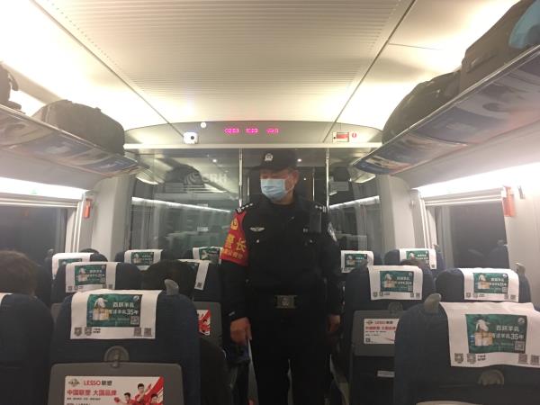 上车后他先检查每节车箱的消防器材,将灭火器从装架上取下来检查的非常仔细……环视车箱内每个角落,一位耄耋老人正困难地把行李往行李架上放,他立即向前搭把手……“我的行李丢了”……4号车厢的文女士找不到自己的黑色手提包,他费尽周折,最终物归原主。忙完这些,他又在车厢里宣传起了疫情防控的注意事项,忙碌的一天只为守卫列车的平安。