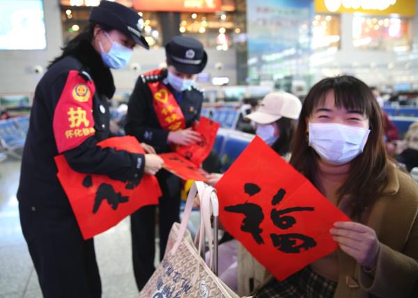 1月28日,是全国铁路春运的第一天。当天,怀化铁路公安处组织一批青年民警来到怀化南站,开展送防疫知识、送春联、送吉祥物宣传活动,为广大出行的旅客送去平安和温馨祝福。