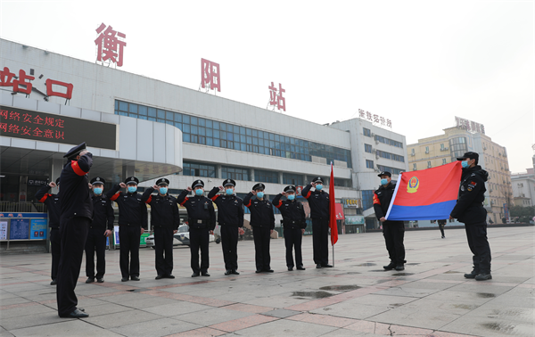 一大早,车站授旗仪式正式开始,衡阳所的民警们早已着装整齐,列队候车室。在飘舞的国旗下,民警接过授予的旗帜,也接过万千旅客的期待与信任。