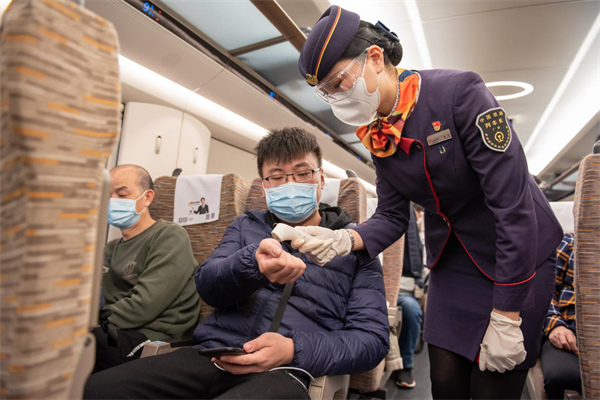 春运期间,广铁集团广九客运段落实常态化疫情防控要求,通过发放宣传手册、列车广播等形式,为乘车旅客普及与防疫相关的知识。同时,切实加强全列车厢卫生消杀与餐饮接触卫生,筑牢高铁列车疫情防护墙,保障旅客出行安全。