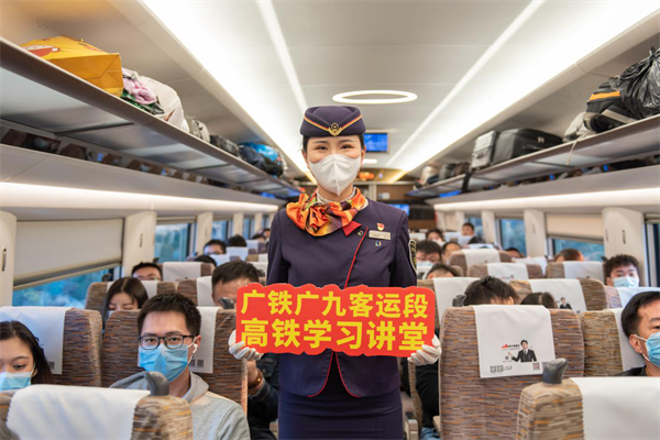 ↑2月1日,广九客运段乘务员正在给旅客开展疫情防控高铁学习讲堂