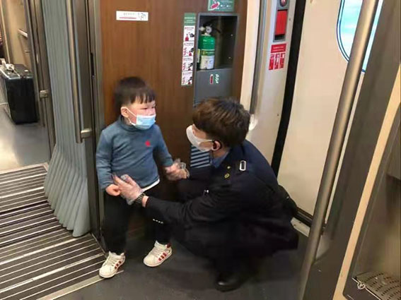 “呜呜呜……”列车刚驶出南昌西站站台,车厢里便传来小孩子的阵阵哭声,蒋晨光立马闻声赶去。原来,一个三岁左右的小男孩因为戴着口罩太闷不舒服,正在与妈妈“作斗争”。