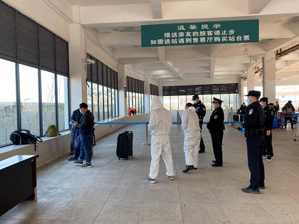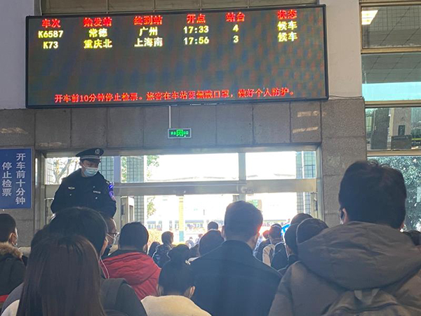 客流量激增引发人群排队,民警协助地方防疫人员维护进出站秩序,确保旅客“一米”排队,“绿码”通行。2月18日两名从非洲回国的返乡人员结束14天集中隔离,返回常德居家隔离。民警配合列车工作人员和当地防疫部门对接交接。“去年由于疫情我们就没有回家,今年克服千难万险我们都要回来!感谢国家防疫部门和人民警察一路上为我们保驾护航,真的是祖国最好!”两人向民警和防疫人员连连挥手道谢。