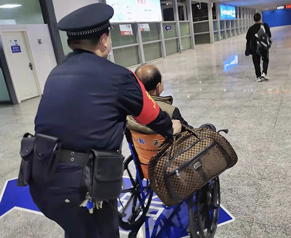 据悉,当日,正在进站口执勤的民警远远看到了一位拄着拐杖,缓缓前行的老人,行动极为不便,民警赶紧上前帮助,并询问老人有没有同行人,老人说话不太清晰,只能摇头同时拿出身份证和车票。民警见状借来轮椅带老人进站,经过耐心沟通了解,民警得知老人还没有吃晚饭,便为老人准备了晚餐,随后推着轮椅将老人一直护送到车厢,并嘱托列车工作人员对其多加照顾。