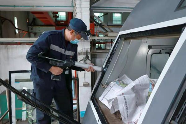 抠掉玻璃周围的胶条,廖继斌沿着缝隙深的上侧将玻璃慢慢推开,然后他挪到作业架上,交替使用毛刷、铲子将窗框里外清理干净,用胶带、报纸做好防护,均匀刷上固底胶后,再沿边框打上约1㎝厚的密封胶。